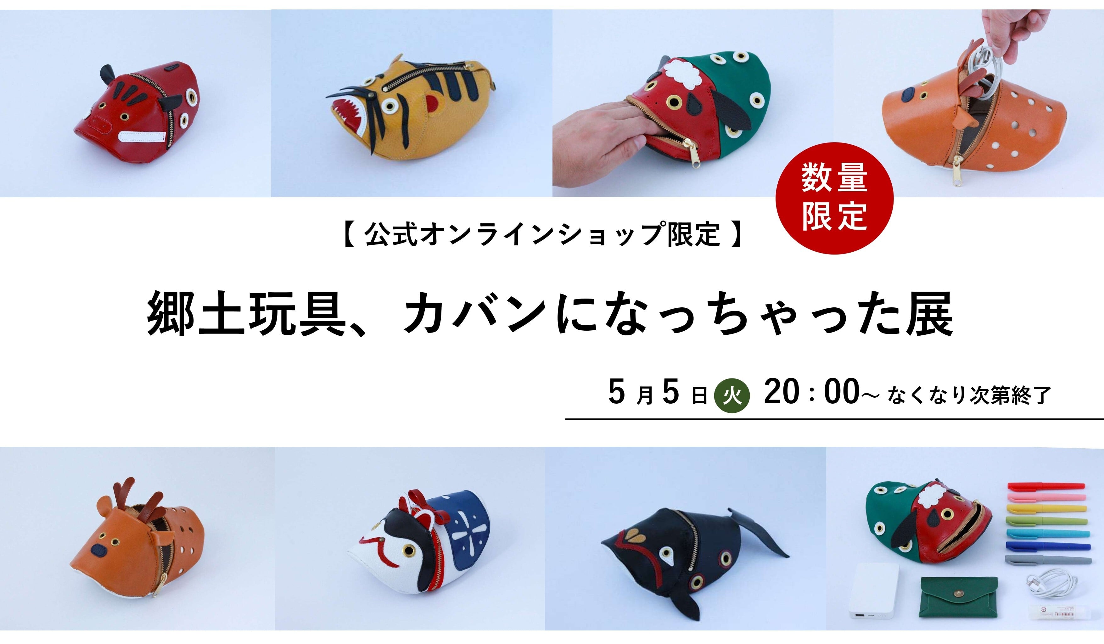 獅子舞、赤べこ、張子犬など人気の郷土玩具の生き物がカバンやポーチになっちゃいました。